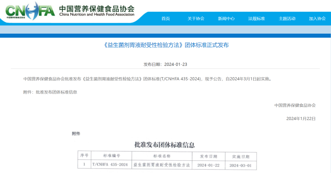1月22日,中国营养保健食品协会正式发布《益生菌剂胃液耐受性检验方法》团体标准。该标准首次建立了益生菌剂胃液耐受性检验方法标准,为益生菌活菌率检验标准再添新维度,将助力益生菌产品质量提升与行业高质量发展。